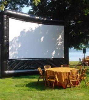 We offer outdoor and indoor inflatable and static movie screens for the complete backyard, corporate, school or organization outdoor movie event. We create an entire outdoor movie theater near me or should we say near you!Our movie screen will include a trained staff member to operate your outdoor movie, outdoor movie projector, sound system, bluray or dvd player. We even offer a wireless microphone to make announcements and play music before the movie starts for your guests.